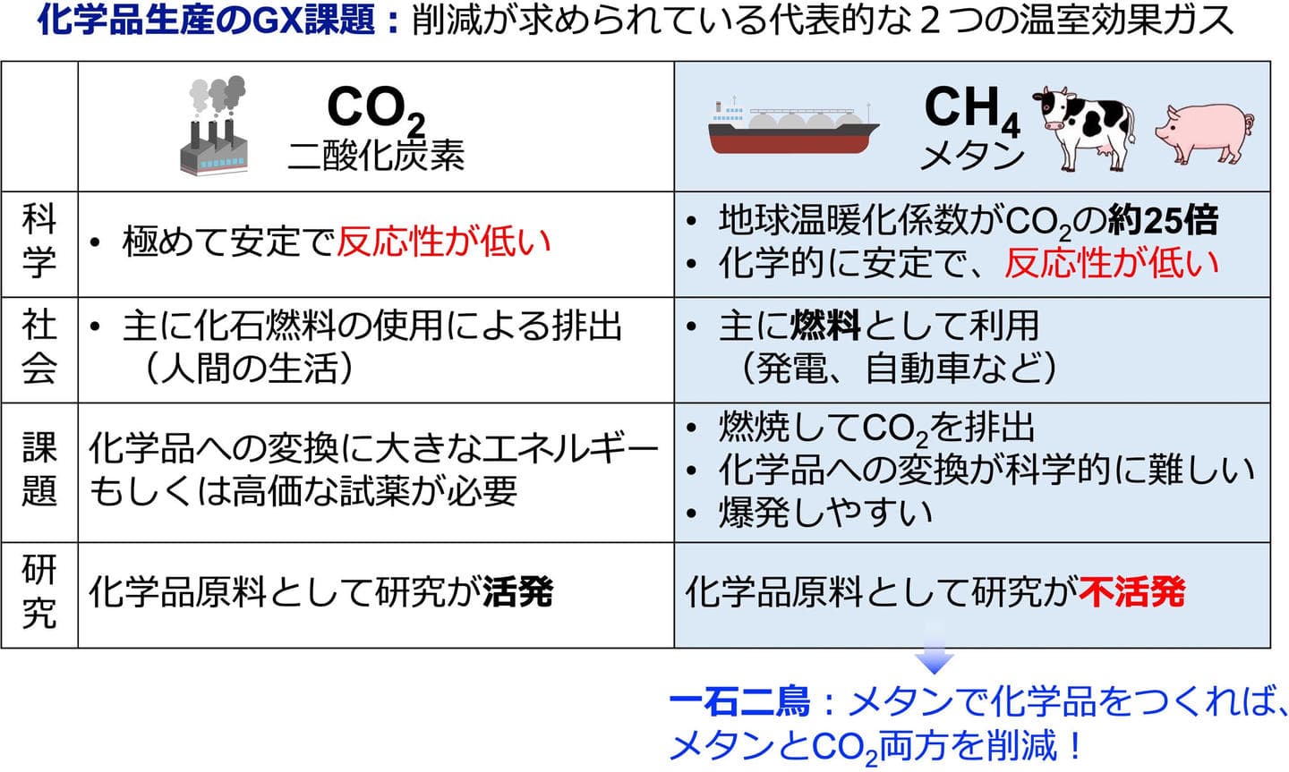 ①地球沸騰化時代が到来し、世界規模での温室効果ガス削減が急務となり、化学品生産分野においてグリーントランスフォーメーション(GX)が強く求められています。また、②近年の情報技術のめざましい発展により、デジタルトランスフォーメーション(DX)による生産の効率化や新製品の創出が求められています。さらに、③コロナ禍や戦争等による国際社会の不安定化による化学品原料の海外調達のリスクが顕在化し、国産の資源を原料にして、国産の新たな科学・技術による、安全・安価・低環境負荷の革新的な方法による、化学品生産の国内回帰が求められています。持続的な社会の実現(SDGs)に向けて、それらの解決は待ったなしの社会的優先課題となっています。